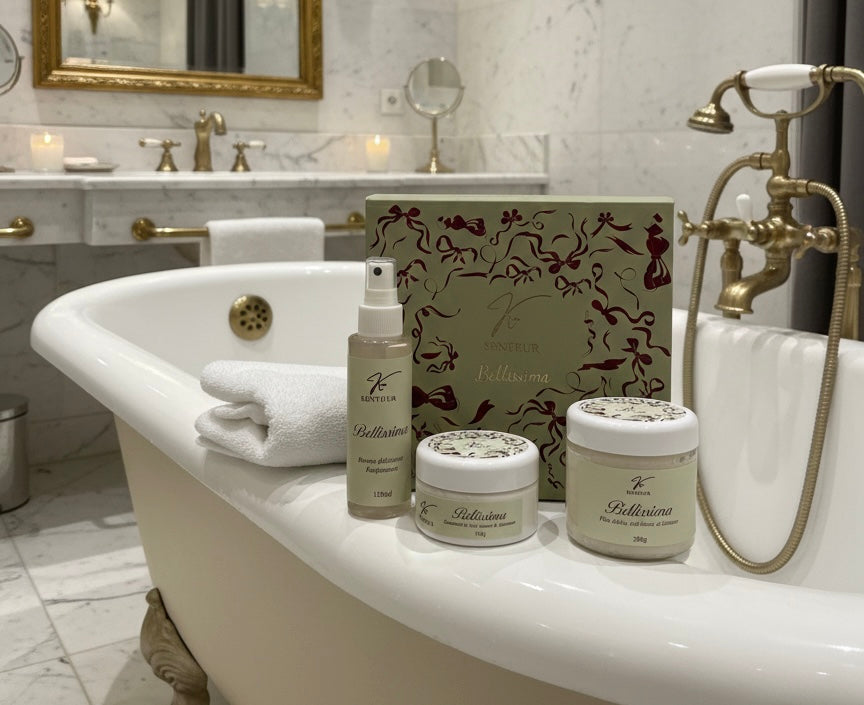 • المقشر المخملي (Body Scrub): يجدد حيوية بشرتك بلطف ويزيل الشوائب، ليتركها ناعمة كالحرير ومهيأة لامتصاص عبير البنفسج الساحر.